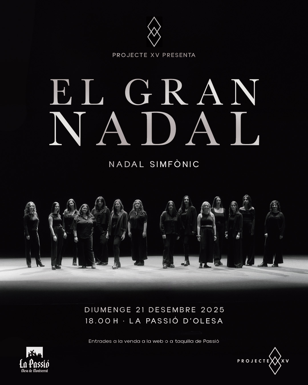 El grup vocal femení Projecte XV (21-30 anys) presenta aquest desembre el seu nou espectacle “El gran Nadal” al Teatre de la Passió d’Olesa de Montserrat. Reconegut per la seva qualitat vocal i l’empast, el grup fusionarà les nadales catalanes més emblemàtiques amb els grans clàssics internacionals.
