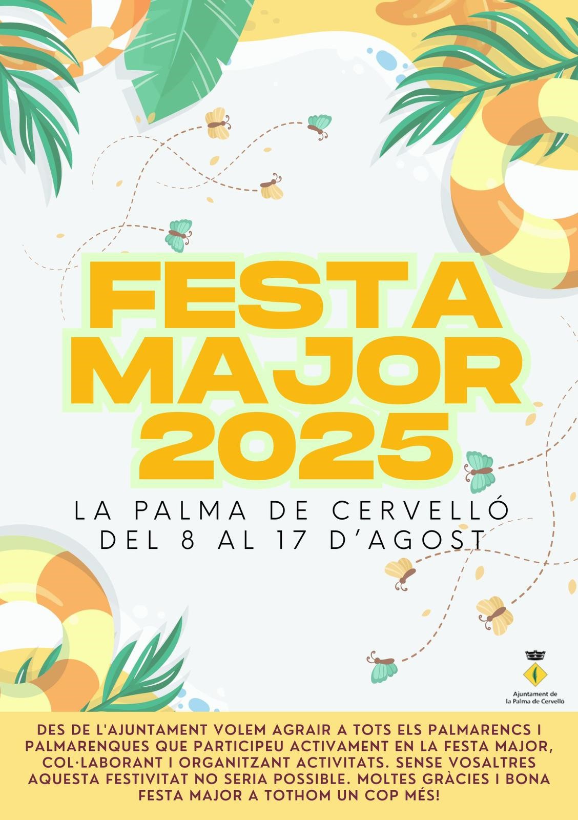 Aquest any, més que mai, celebrem que la Palma és un poble viu, dinàmic, compromès i amb ganes de mirar endavant. Cada acte del programa és una mostra de la nostra vitalitat i del teixit social que ens fa únics: entitats, associacions, voluntaris i veïns i veïnes que feu possible una festa que és patrimoni col·lectiu.
