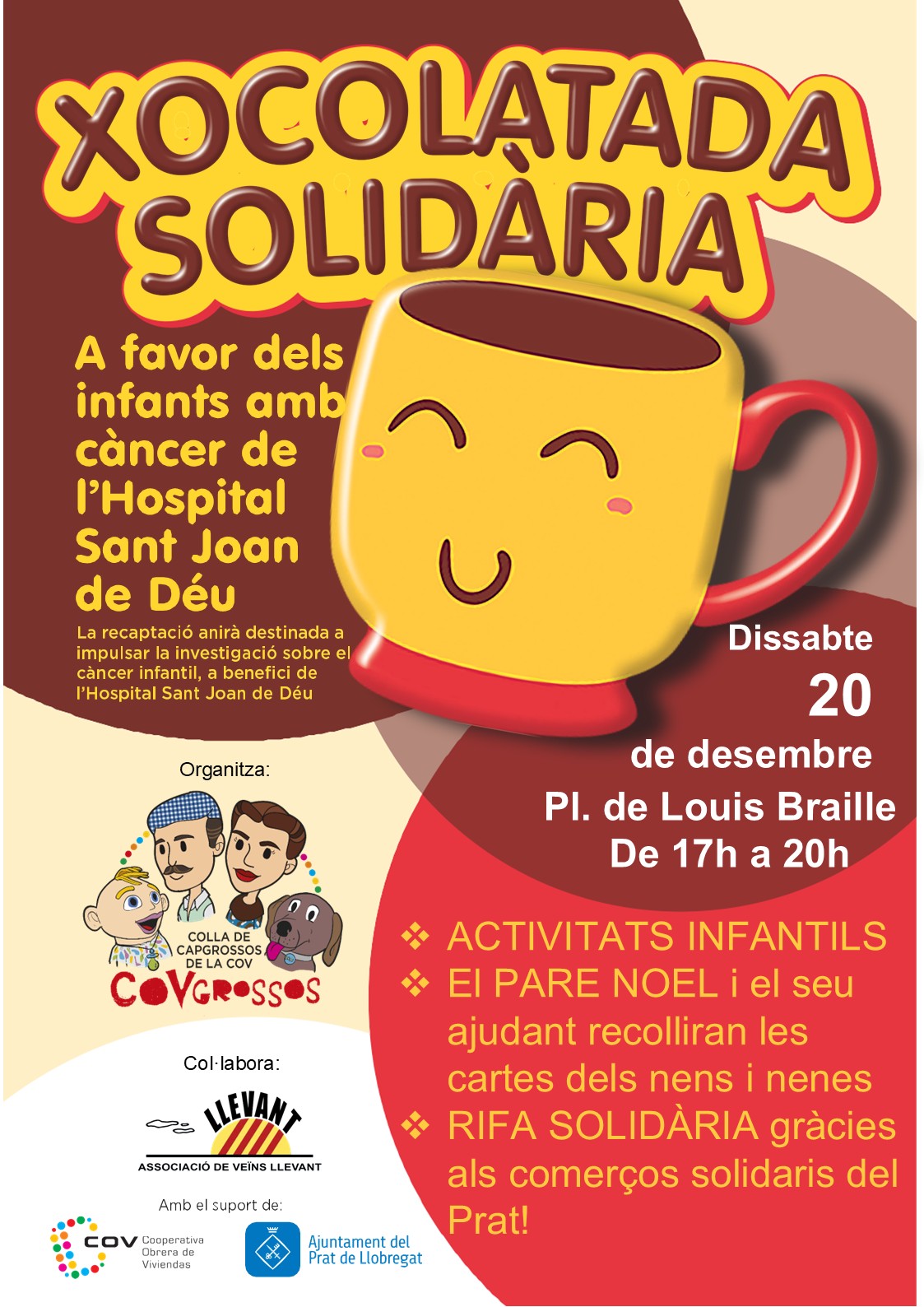 Vine a passar una tarda divertida amb activitats infantils, participa de la Xocolatada Solidària i de la rifa plena de regals solidaris de comerços, restaurants i entitats del Prat de Llobregat. Tot el que es recapti anirà a la investigació del càncer infantil de L'Hospital Sant Joan de Déu. A més hi haurà la visita del Pare Noel i el seu ajudant, l'Elf entremaliat per recollir les cartes de tots els infants! Us podreu fer fotos i ballar amb ells. No t'ho perdis!!