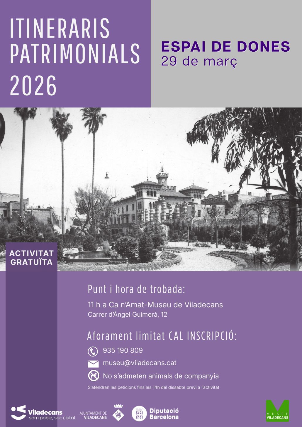 Itinerari Patrimonial especial del Dia Internacional de les Dones. Reprogramem el recorregut guiat pels diversos espais de Viladecans vinculats a la presència i al llegat de dones de Viladecans. Dones que han deixat una empremta significativa en la història i el desenvolupament del nostre municipi. Una proposta per descobrir, conèixer i posar en valor les seves aportacions, tot commemorant el mes de les dones.